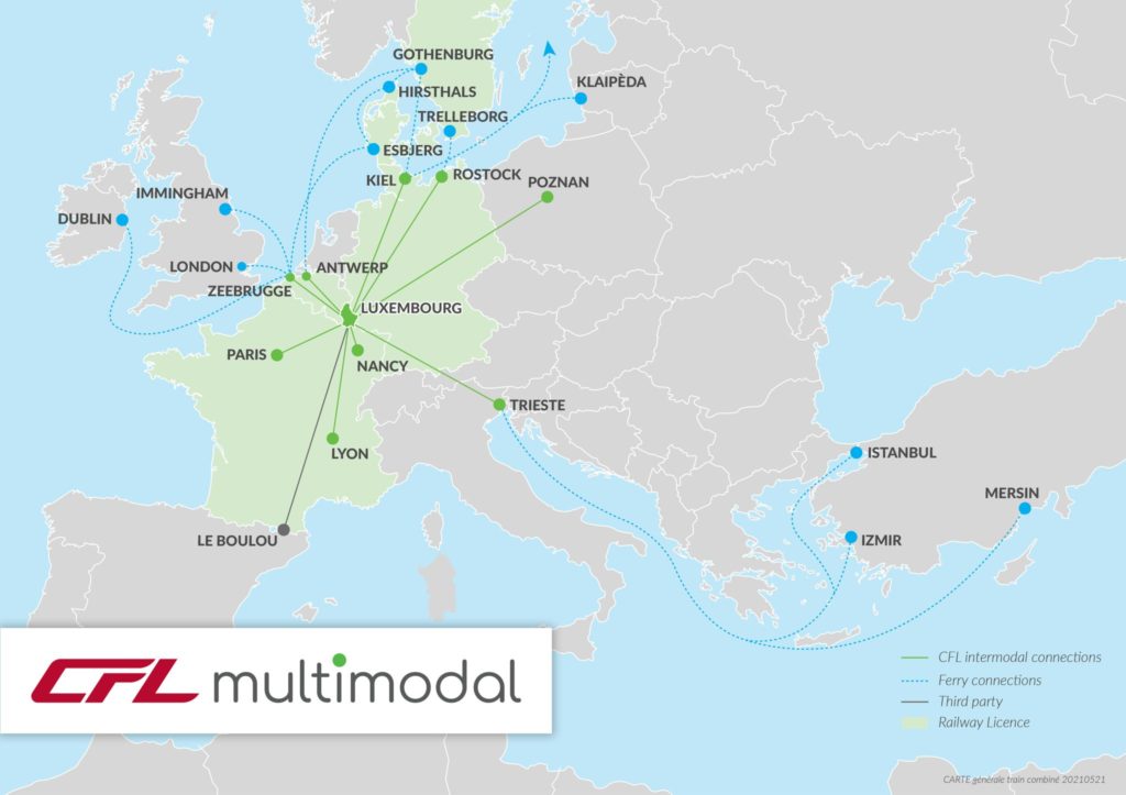 CFL multimodal hat die Frequenz der Züge Bettembourg – Lyon seit Juni 2021 auf sieben wöchentliche Rundläufe erhöht. Die Traktion übernehmen CFL cargo Luxemburg sowie CFL cargo France.