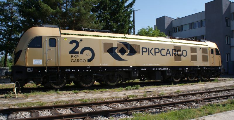 Die PKP CARGO S.A. feiert in diesem Jahr ihren 20. Geburtstag. Aus diesem Anlass hat ET25-001 des Typs Newag Dragon eine spezielle Beklebung auf goldenem Grund erhalten. Der „Golden Dragon“ ist die erste von drei sechsachsigen Lokomotiven, die PKP CARGO 2018 erworben hatte.