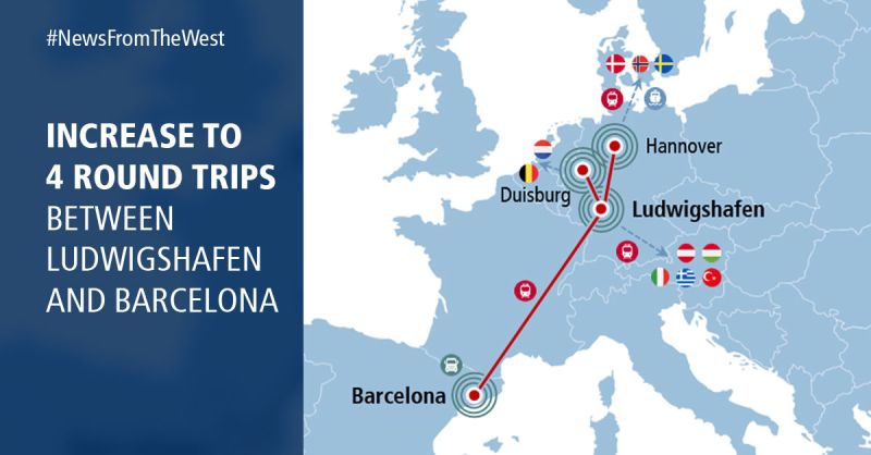Die Kombiverkehr KG baut ihr Leistungsangebot auf der Mittelmeerroute im Spanienverkehr weiter aus. Per 21.09.2021 wird ein neuer vierter Rundlauf pro Woche und Richtung auf der Verbindung zwischen Ludwigshafen und Barcelona Morrot aufgesetzt. Die neu geschaffenen Kapazitäten sollen neben Tankcontainern insbesondere durch den verstärkten Einsatz von T3000-Megatrailer-Doppeltaschenwagen Sattelaufliegern zugutekommen.
