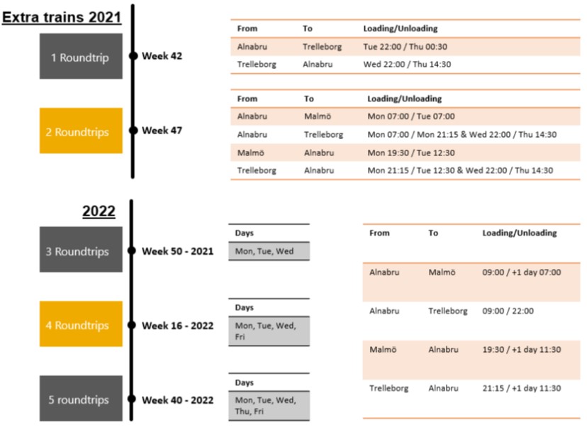 Die norwegische Güterbahn CargoNet verdichtet ihren Fahrplan zwischen dem Terminal Alnabru nahe Oslo und Malmö bzw. Trelleborg in Schweden. Zusätzlich zu den heutigen abendlichen Abfahrten von Alnabru nach Malmö / Trelleborg wird der neue Shuttle ab dem nächsten Jahr eine Abfahrt von Alnabru am Morgen mit Ankunft in Trelleborg am Abend desselben Tages haben. Der Zug fährt noch am selben Abend zurück und kommt am nächsten Morgen in Alnabru an.
