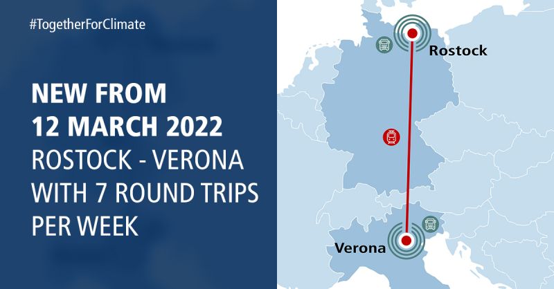 Kombiverkehr verdichtet die Abfahrten auf der Route Rostock – Verona Interterminal. Seit 12.03.2022 werden sieben statt zuvor sechs Rundläufe pro Woche angeboten.