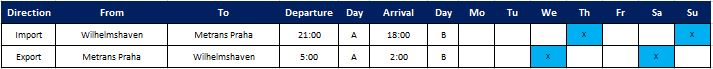 Der Intermodaloperateur Metrans verbindet das eigene Hub-Terminal in Prag seit 03.07.2022 zwei Mal pro Woche mit dem JadeWeserPort (JWP) in Wilhelmshaven. Gründe für die neue Relation sind die Abwanderung von Reedereien von anderen Häfen nach Wilhelmshaven sowie die Überlastung von anderen Hafenstandorten.