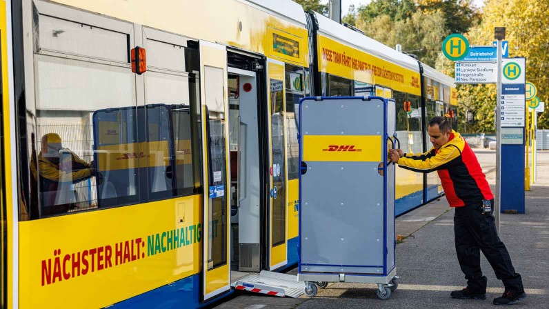 Die Deutsche Post DHL Group hat in der Landeshauptstadt Mecklenburg-Vorpommerns am 28.10.2022 den Pakettransport via Paketbahn offiziell gestartet. Ab sofort werden auf der neuen Sonder-Linie im Citybereich werktäglich rund 450 DHL-Paketsendungen transportiert. Die Anlieferung der Sendungen am Betriebshof erfolgt CO2-neutral per ökostrom-betriebenem StreetScooter.