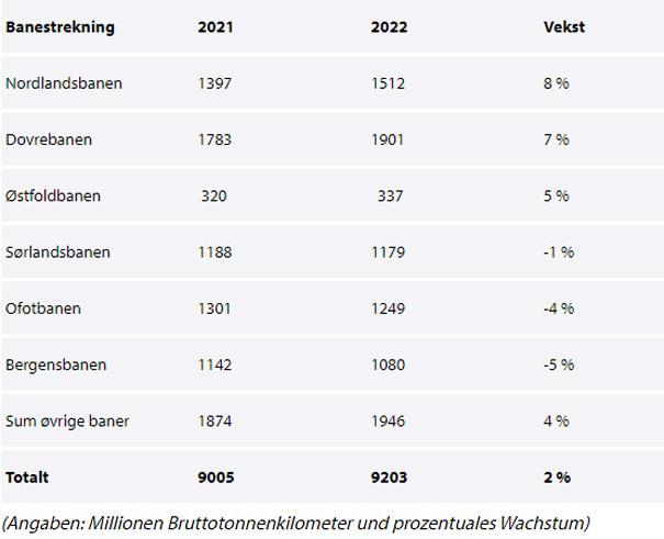 Der Güterverkehr auf der Bahn nimmt in Norwegen zu. Dies gab der Netzbetreiber Bane NOR bekannt. Im Jahr 2022 stieg der Güterverkehr auf der Nordlandsbanen um acht Prozent. Auf der Dovrebanen und der Østfoldbanen lag das Wachstum bei sieben bzw. fünf Prozent. Insgesamt hat der Güterverkehr im ganzen Land um zwei Prozent zugenommen. Die Entwicklung im Jahr 2022 ist zwar geringer als im Jahr 2021, aber der Trend ist immer noch positiv.