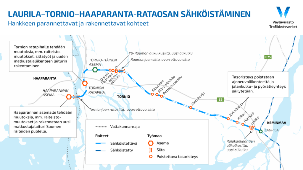 Im Mai wird auch mit der Installation von Fahrleitungsmasten begonnen. Geplant ist zudem der Ausbau der Eisenbahngrenzbrücke über den Fluss Tornio und der Umbau des Bahnhofs Tornio sowie des Bahnhofs Haparanda auf schwedischer Seite bis Ende 2024. Das Projekt wird u. a. die Voraussetzungen für die Wiederaufnahme des grenzüberschreitenden Personenverkehrs schaffen und durch die EU-Fazilität „Connecting Europe“ (CEF) unterstützt. Das Gebiet von Tornio und Haparanda ist ein Knotenpunkt für internationale Verkehrskorridore und Teil der bevorstehenden Erweiterung des TEN-Kernnetzkorridors um den Bottnischen Meerbusen, welcher die Barentsregion mit dem mitteleuropäischen Verkehrskorridor und weiter mit dem Fernen Osten verbindet.