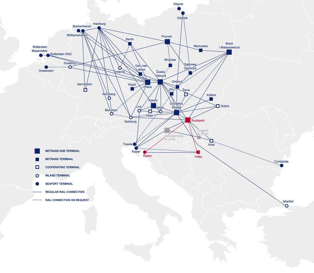 METRANS verbindet ab 01.06.2023 den kroatischen Hafen Rijeka (AGCT Terminal) mit dem eigenen Terminal in Budapest-Csepel, Ungarn, und dem serbischen Terminal in Inđija. An Letzterem ist METRANS seit März 2023 Anteilseigner. Angedacht sind drei Rundläufe pro Woche.