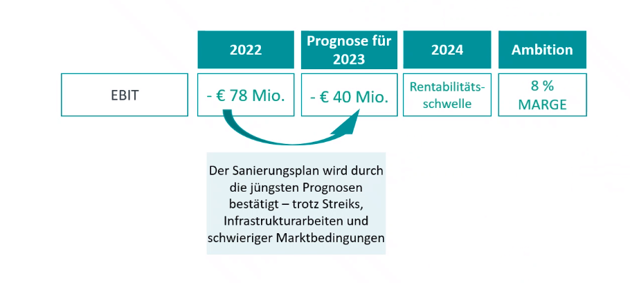 Die belgische Güterbahn Lineas will schon im kommenden Jahr und nicht wie zunächst geplant erst 2025 wieder schwarze Zahlen schreiben. Dies gab CEO Bernard Gustin auf einer Pressekonferenz am 23.10.2023 bekannt. Für das laufende Geschäftsjahr rechnet das Unternehmen mit einem Verlust von 40 Mio. EUR, 2022 war dieser mit 78 Mio. EUR Verlust nahezu doppelt so hoch gewesen. Für den mittelfristigen Zeitraum peilt Lineas eine EBIT-Marge von 5-8 % an.