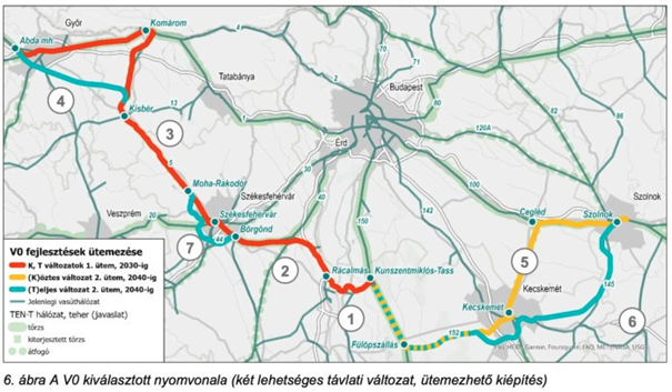 Die alte Idee von 2012 sah eine Neubaustrecke auf der grünen Wiese vor, die bei Ercsi die Donau queren sollte und nur an wenigen Stellen an das bestehende Schienennetz angeschlossen war. Ein solches Projekt könnte heute durch gesellschaftliche Widerstände bedroht sein, zumal in der Zwischenzeit in der Agglomeration Budapest ständig neue Gebiete erschlossen wurden. Für die zukünftige V0 sollen nun bekanntlich bereits vorhandene Strecken so weit wie möglich ausgenutzt werden, natürlich im notwendigen Umfang umgebaut, d. h. elektrifiziert, zweigleisig und für eine Achslast von 22,5 t, eine Geschwindigkeit von mindestens 100 km/h, und für den Güterverkehr idealen Steigungsverhältnissen mit einer maximalen Steigung von 5 – 6 Promille.