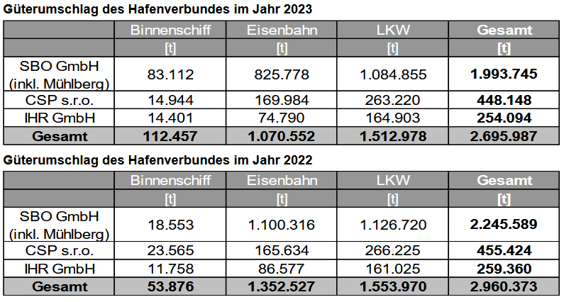 Der Hafenverbund der Sächsischen Binnenhäfen Oberelbe GmbH (SBO) blickt nach eigener Auskunft trotz einer allgemeinen schwierigen wirtschaftlichen Lage auf ein gutes Geschäftsjahr 2023 zurück: Insgesamt wurden 2,7 Millionen Tonnen Güter in den Häfen umgeschlagen – ein Rückgang von 8,9 % gegenüber dem Jahr 2022. Zum SBO-Hafenverbund gehören die Binnenhäfen in Dresden, Riesa, Torgau, Mühlberg, Decin, Lovosice und Dessau-Roßlau.