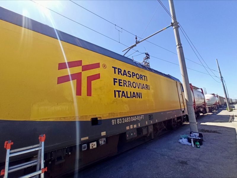 Die Logos der neu aus der Ferrotramviaria (Ft) ausgegründete Güterbahn Trasporti Ferroviari Italiani (TFI) werden nun auch auf den Loks aufgebracht.