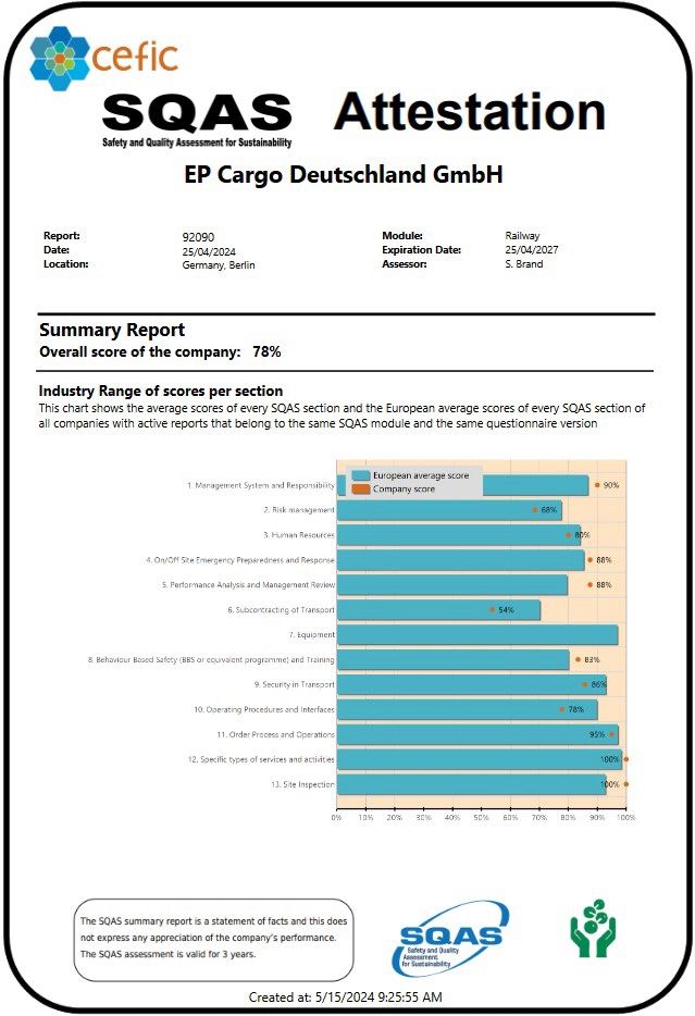 Die EP Cargo Deutschland GmbH hat am 25.04.2024 das Verfahren zur Bewertung nach SQAS (Safety and Quality Assessment System) mit einer Punktzahl von 78 abgeschlossen.