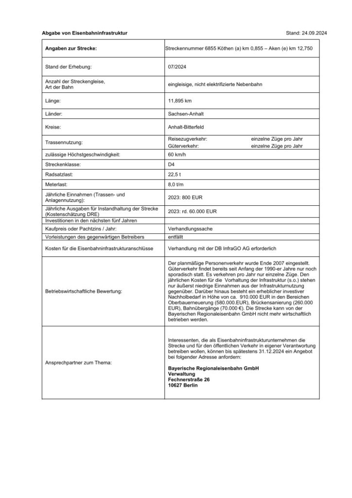 Die Bayerische Regionaleisenbahn (BRE) hat die 12 km lange Strecke zwischen Köthen und dem Hafen Aken zur Übernahme gemäß § 11 Abs. 1a Satz 1 Ziffer 2 Allgemeines Eisenbahngesetz (AEG) ausgeschrieben. Die Tochter der Deutschen Regionaleisenbahn (DRE) hatte die damals schon defizitäre Strecke 2011 von DB Netz übernommen, nachdem Übernahmeverhandlungen mit dem Hauptnutzer Hafenbetrieb Aken gescheitert waren.
