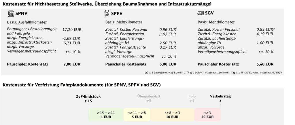 Die Pauschale im SPFV berücksichtigt Mehrkosten für Personal, Energie, laufleistungsabhängige Instandhaltung und Fahrgastrechte. Hieraus ergibt sich eine Pauschale i.H.v. 6,00 EUR je Mehrkilometer.