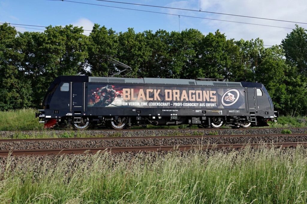 Die von DB Cargo übernommene 185 329 der EBS Erfurter Bahnservice Gesellschaft wirbt nun für den Erfurter Eishockeyclub „Black Dragons“. Für gleichen Verein hatte bereits vor rund zehn Jahren die 142 145 der EBS geworben.
