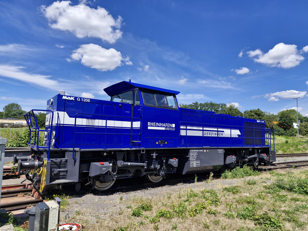 Der Rheinhafen Krefeld hat seiner 25 Jahre alten Lok D4 (Vossloh G 1206) im Rahmen einer Hauptuntersuchung (HU) einen Neulack in Blau und den Taufnamen „Uerdingen“ spendiert. Zuvor war die Maschine rot lackiert.