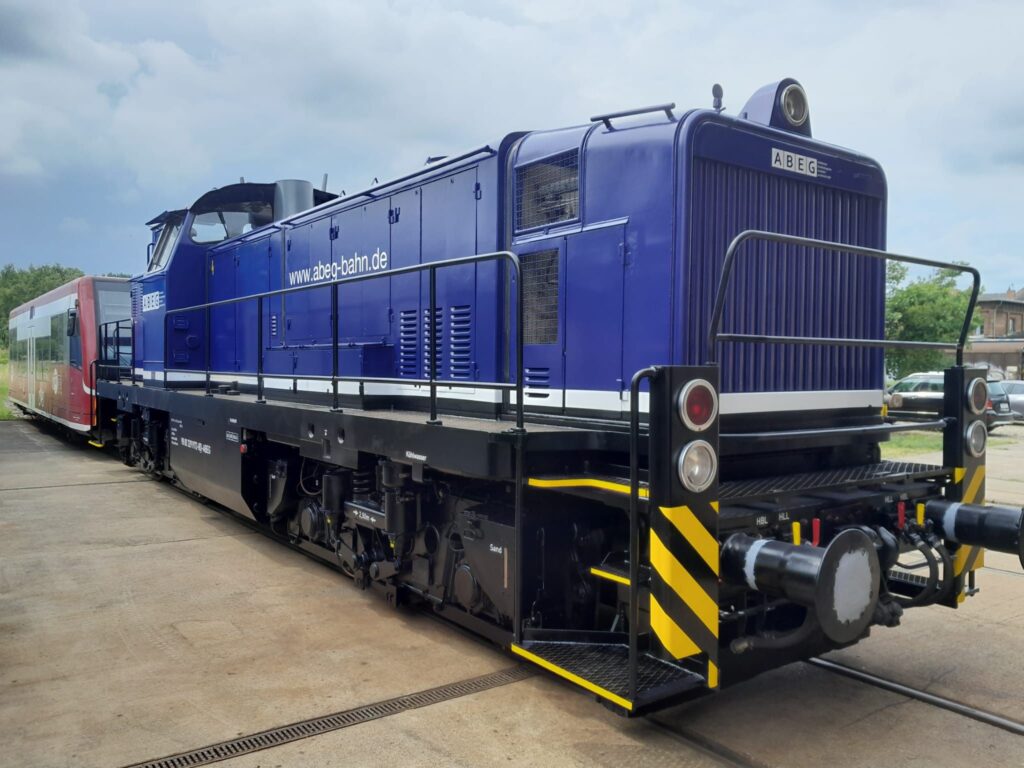 98 80 3291 972-8 der Anhaltinisch-Brandenburgischen Eisenbahngesellschaft (ABEG) wurde in der Werkstatt Meyenburg neu lackiert. Für die 1971 ausgelieferte MaK G 1600 BB ist dies die vierte Farbgebung nach einer Lackierung im Layout der Vorbesitzer Bayerische Braunkohlen-Industrie (BBI), Osthannoversche Eisenbahnen (OHE) und Nothrail.