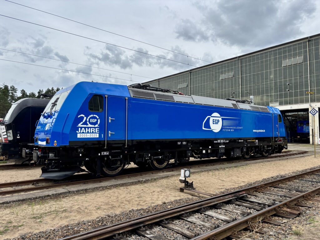 Mit 185 303 erstrahlt die TRAXX AC2 der Eisenbahngesellschaft (EGP) nach Hauptuntersuchung (HU) im Ostmecklenburgischen Bahnwerk (OMB) in den Firmenfarben. Die Inbetriebnahme soll in Kürze erfolgen.