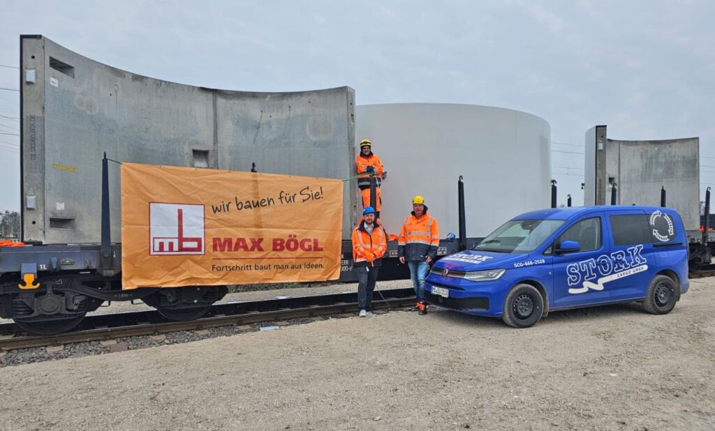 Im Gleisanschluss von STORK Cargo in Magdeburg-Rothensee erfolgt aktuell der Umschlag von Betonfertigteilen der Max Bögl für Windkraftanlagen.
