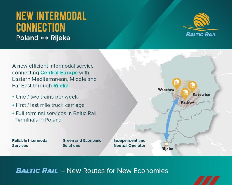 Der Intermodalanbieter Baltic Rail startet in Kalenderwoche 18 / 2026 eine neue Verbindung zwischen den beiden eigenen Terminals nahe Katowice (Terminal Kontenerowy Włosienica) und Wrocław (Terminal Kontenerowy Oleśnica-Cieśle) sowie Paskov in Tschechien und dem Mittelmeerhafen Rijeka. Geplant sind 1-2 Umläufe pro Woche als Ergänzung des bisherigen Services Polen – Koper. Rijeka – Polen war erstmals im April 2022 angeboten worden.