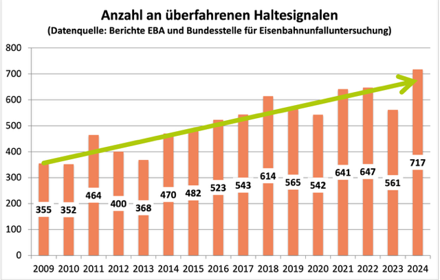 Die Anzahl an überfahrenen Haltesignalen hat 2024 in Deutschland mit 717 Vorfällen einen neuen Höchststand erreicht. Davon erreichten 124 den Gefahrenpunkt – auch das ein neuer Höchststand. Im Vorjahr waren es 561 zu 108. Diese Zahlen hat das Eisenbahn-Bundesamt (EBA) vor Kurzem im Sicherheitsbericht für das Jahr 2024 veröffentlicht.