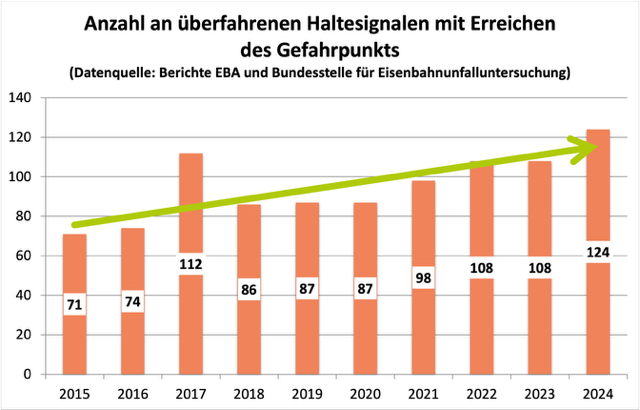 Zuvor waren in den Jahren 2014 bis 2018 teilweise deutliche Anstiege zu beobachten, wohingegen die Zahlen der Signalüberfahrten in den Jahren 2019 und 2020 zurückgingen, um dann seit 2021 wieder anzusteigen. Die überfahrenen Haltesignale bleiben daher ein Schwerpunkt der Überwachung durch das EBA, so die Behörde.