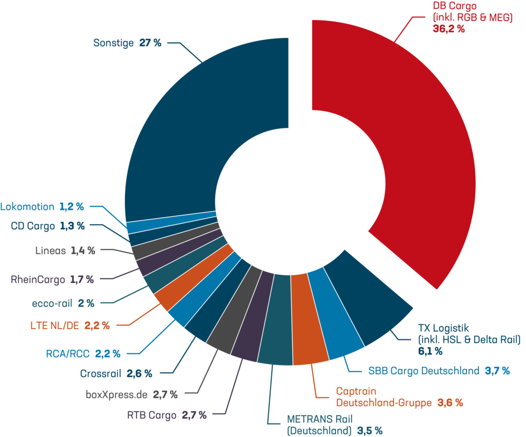 Erstmalig wurden für den Wettbewerber-Report Trassen- statt Tonnenkilometer mittels Vollmachten direkt bei der DB InfraGO abgefragt. Reine Lokfahrten bleiben unberücksichtigt.