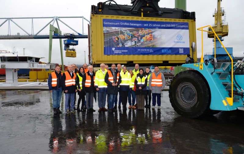 thyssenkrupp Rasselstein, Becker & Co., die Stadtwerke Andernach und Haeger & Schmidt Logistics (HSL) feierten jüngst den 250.000sten im Hafen Andernach umgeschlagenen Container. Die Kooperation begann vor 25 Jahren – Andernach war damals noch ein Containerterminal im Aufbau.