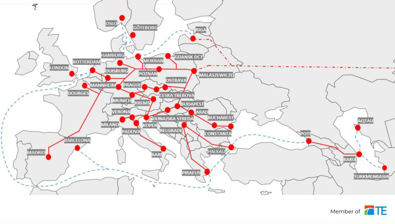 Bahnoperator hat jüngst eine Netzgrafik der (normalspurigen) europäischen Seite des eurasischen Korridors publiziert. Im Einsatz sind dort gemietete Siemens Vectron MS sowie über 200 Intemodalwagen des Operateurs sowie Partnerbahnen.