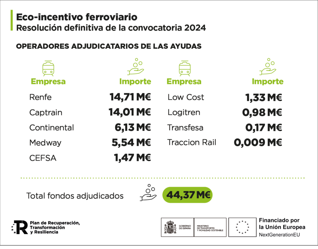 Acht spanische Güterbahnen erhalten rückwirkend für das Geschäftsjahr 2024 Fördermittel aus dem EU-finanzierten Plan für Erholung, Transformation und Resilienz (Plan de Recuperación, Transformación y Resiliencia (PRTR)):