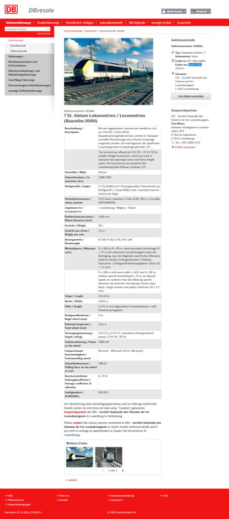 Die luxemburgische Staatsbahn CFL nutzt das Portal der DBresale für die Auktion von sieben Loks der Baureihe 3000. Gebote können bis 28.02.2021 eingereicht werden, die Lok stehen ab 09.2022 zur Verfügung.