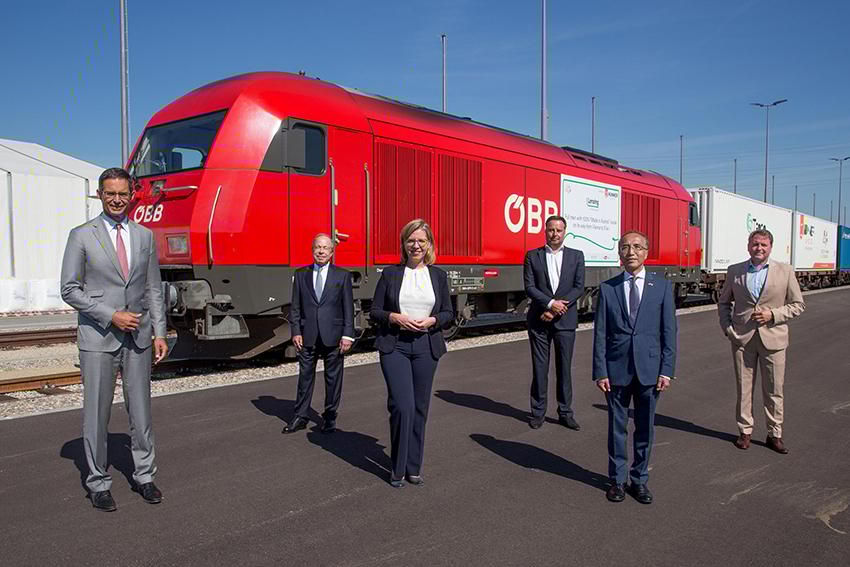 Den Zug verabschiedeten Bundesministerin Leonore Gewessler, Xiaosi Li, Botschafter der Volksrepublik China in Österreich, Stefan Doboczky, Vorstandsvorsitzender der Lenzing Gruppe, Erwin Cootjans, CEO von Nunner Logistics, Erich Hampel, Vorstandsvorsitzender der B&C Privatstiftung und Thomas Kargl, Vertriebsvorstand Rail Cargo Group. Quelle: Rail Cargo Group