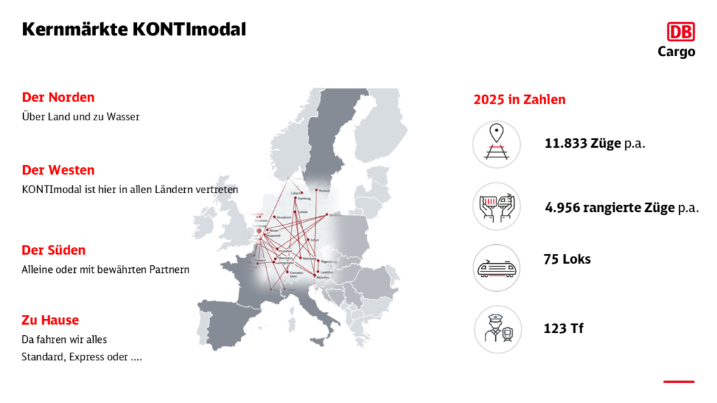 Seit Anfang 2025 ist der Kombinierten Verkehr (KV) der DB Cargo in zwei Bereiche gegliedert: den maritimen KV, der Seehäfen und Industriezentren verbindet, und den kontinentalen KV – KONTImodal, der Terminals in Deutschland und Europa miteinander verknüpft. Jüngst hat die Güterbahn weitere Details zu der Aufstellung publiziert die wir nachfolgend wiedergeben.