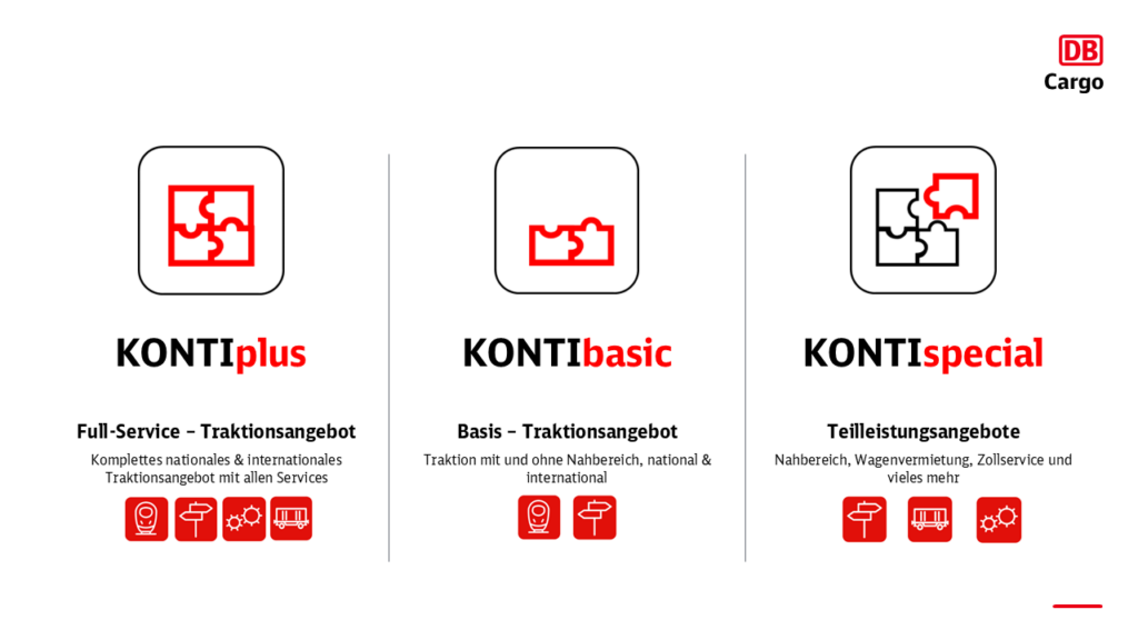 Die KONTImodal – Produktlogik bündelt die Leistungen zu Lösungen: Full-Service-Lösungen für komplexe Transportketten, reine Traktion und Teilleistungen wie Nahbereich, Wagenvermietung oder Zollservices.
