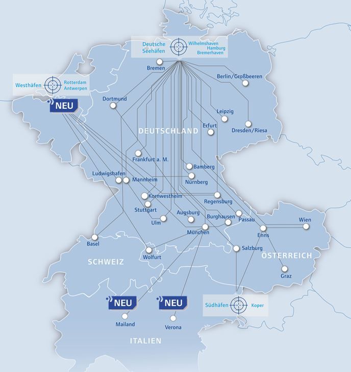 Über die nationalen Gatewayterminals und Hafenkais in Ludwigshafen, Lübeck, München und Duisburg erreichen Kunden mit Kombiverkehr unter anderem die Niederlande, Belgien, Schweden, Norwegen, Frankreich, Spanien, Österreich, Ungarn, Griechenland und die Türkei.