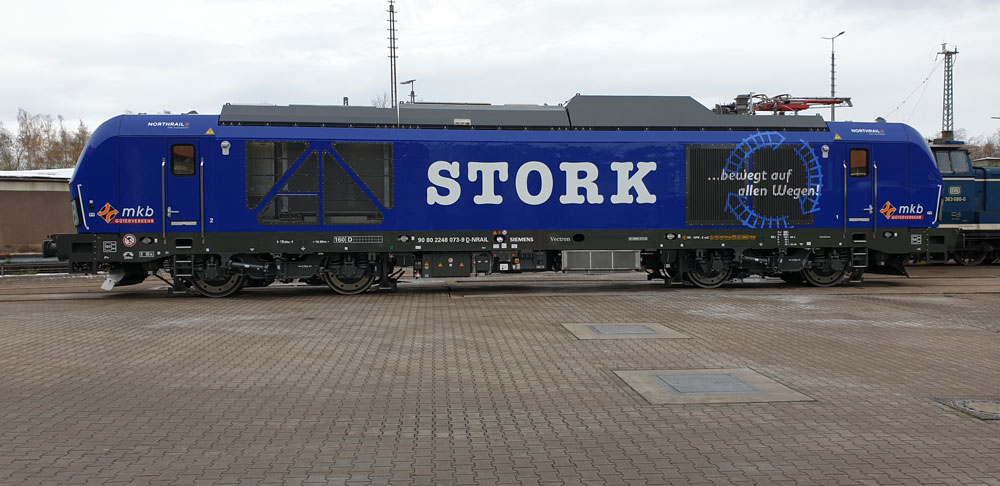 Bei den Mindener Kreisbahnen (mkb) trägt die von Northrail gemietete 248 073 seit 01.12.2023 eine Werbebeklebung für den Kunden STORK Umweltdienste.